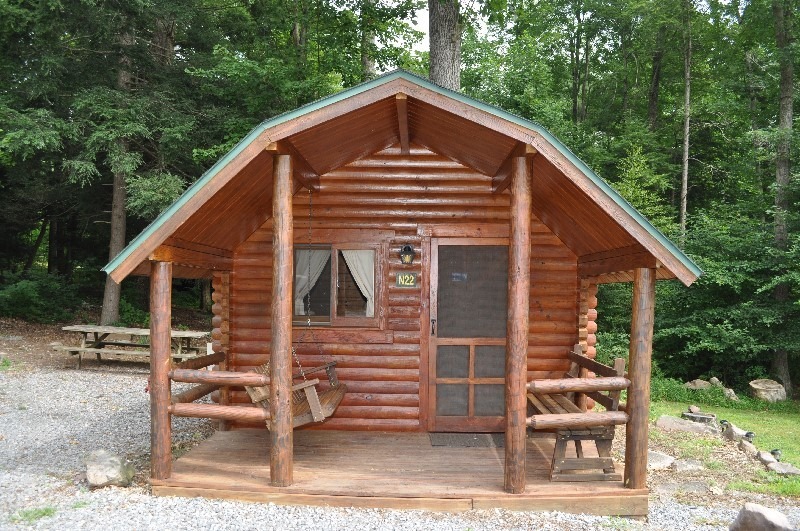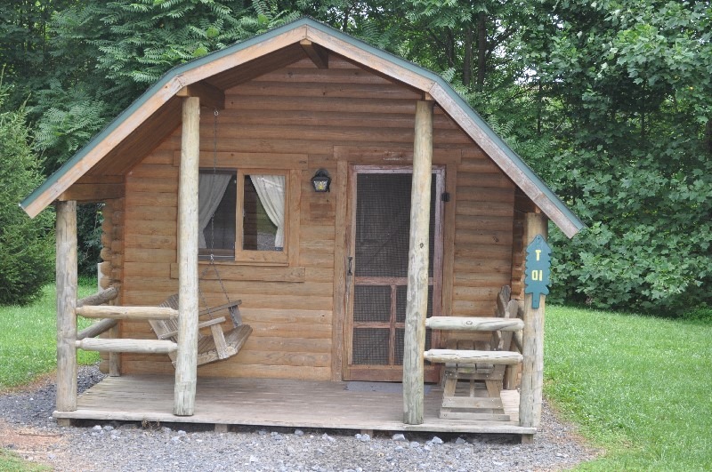 These pet-friendly two-room cabins sleep up to six with a double bed and bunk beds, air conditioning, cable, and access to a nearby bathhouse. Outdoor fire ring, charcoal grill, and picnic table are included alongside full access to resort amenities.